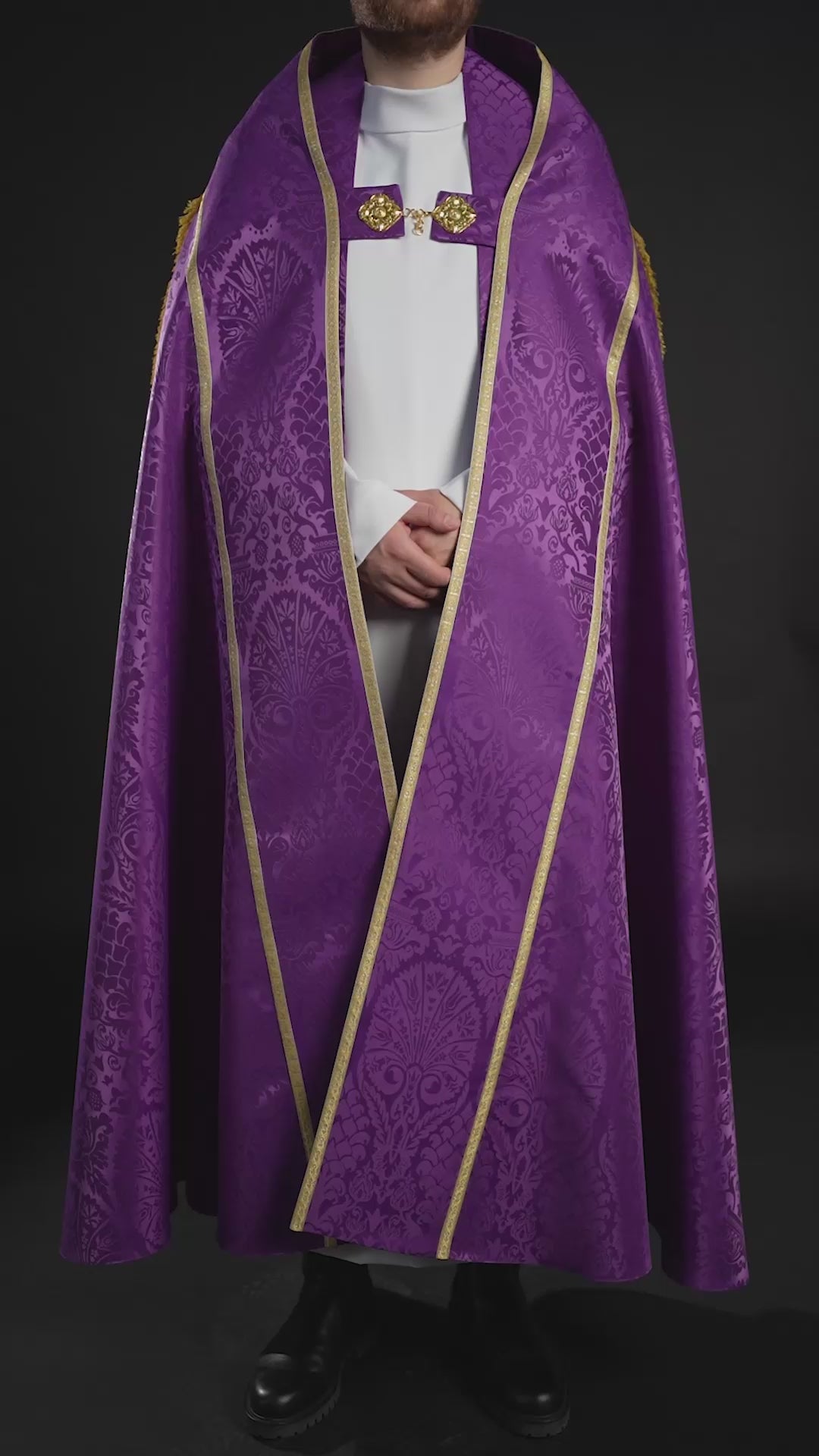 Elegancka kapa rzymska wykonana z wysokiej jakości tkaniny żakardowej w kolorze fioletowym. Materiał ozdobiony jest wytłaczanym, dekoracyjnym wzorem liturgicznym o klasycznym, roślinnym motywie, co nadaje szacie uroczysty i szlachetny charakter.