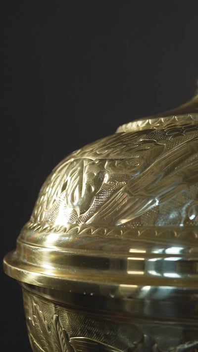 Mosadzná krstiteľnica vyrobená z lisovaného mosadzného plechu, zdobená rastlinnými motívmi so symbolikou viniča.