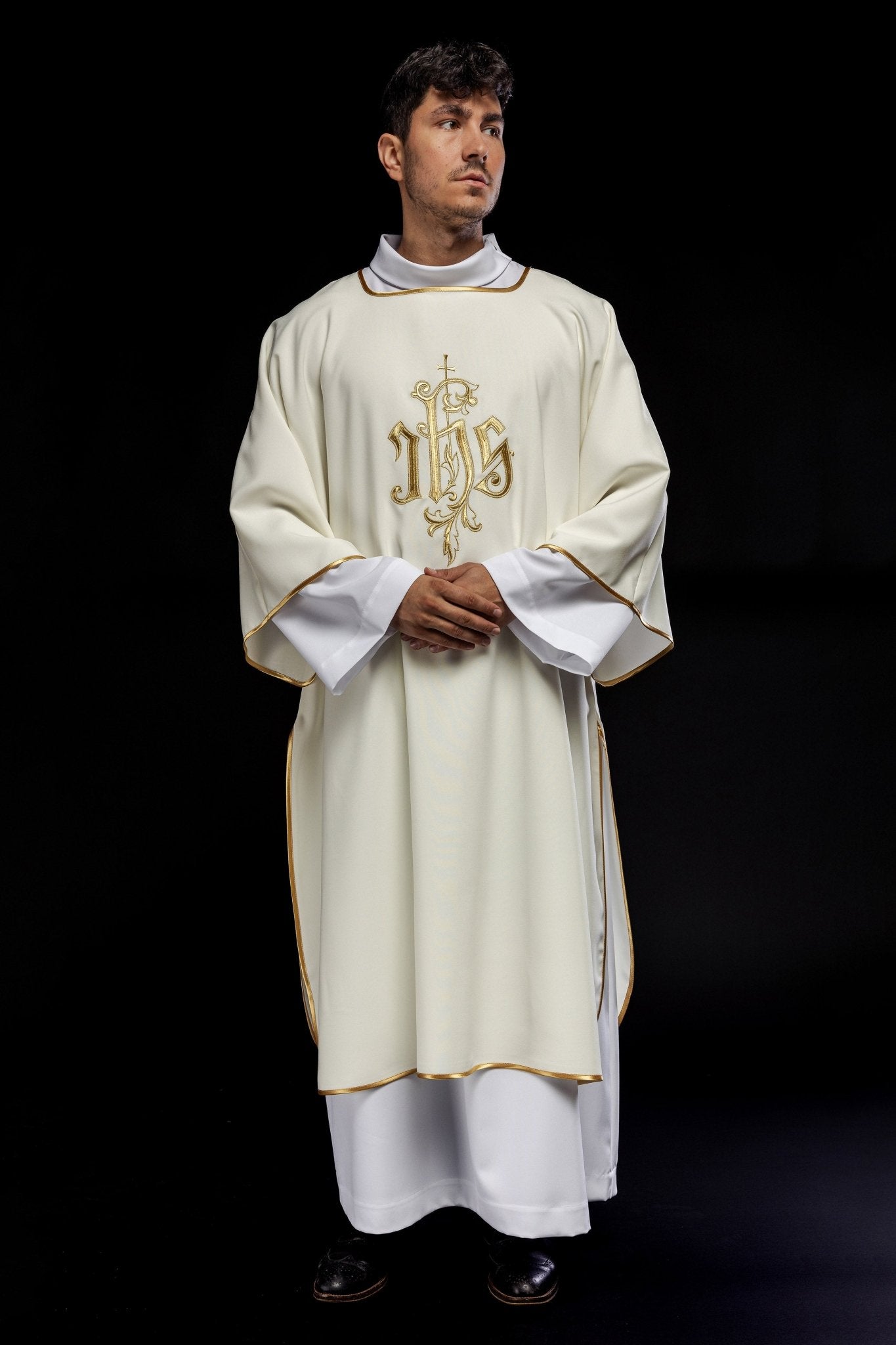 Dalmatyka wykonana z gładkiej tkaniny, zdobiona haftem w kolorze złotym.