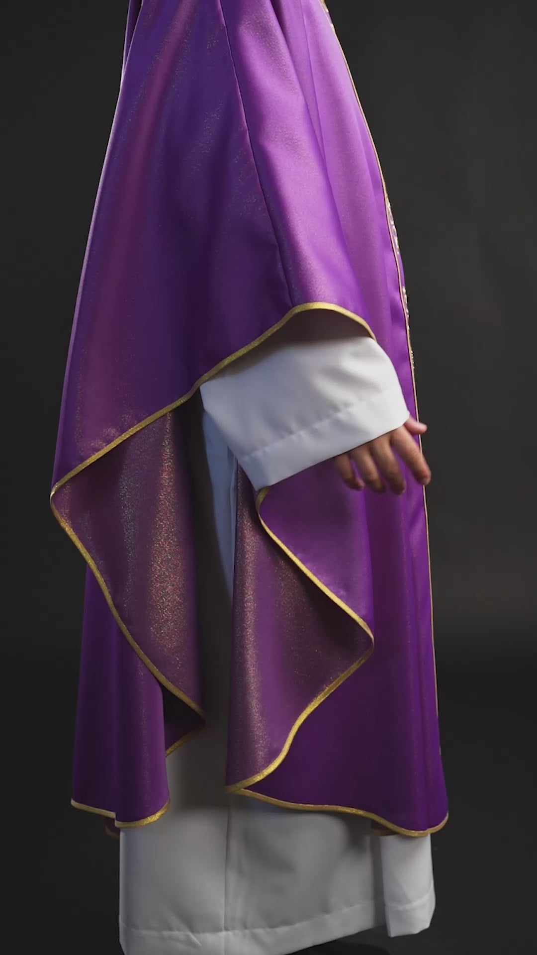 - Tkanina wykonana jest w z 100% PE. Ornat dodatkowo ozdobiono haftem wykonanym złotymi nićmi, który przedstawia motyw florystyczny. Lamówka, którą obszyto szatę, zapobiega strzępieniu się materiału.