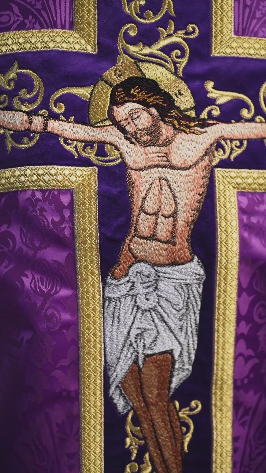 Ornat wykonany z wysokiej jakości tkaniny, zdobiony pasem z haftowanym wizerunkiem Chrystusa.