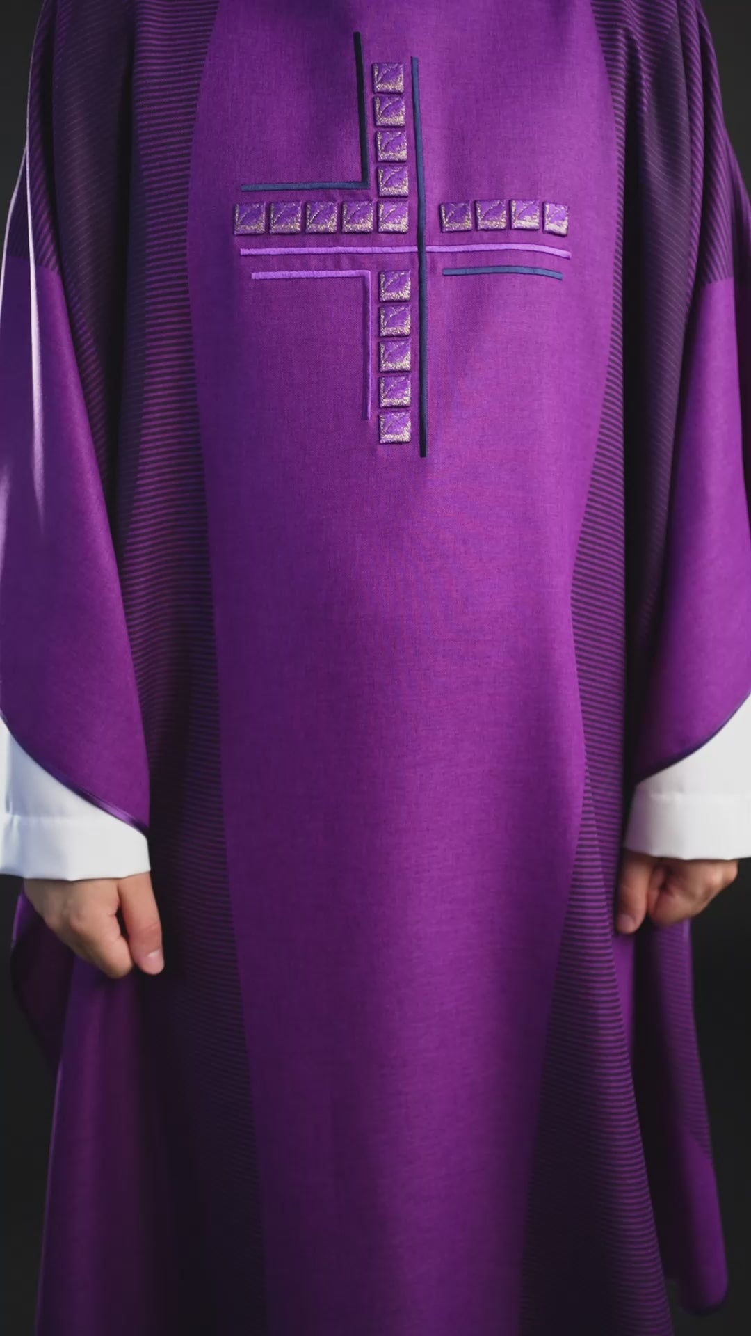 Ornat wykonany z wysokiej jakości tkaniny gładkiej, zdobiony haftowanym symbolem krzyża. Całość wykończona lamówką. Dostępny we wszystkich kolorach liturgicznych.