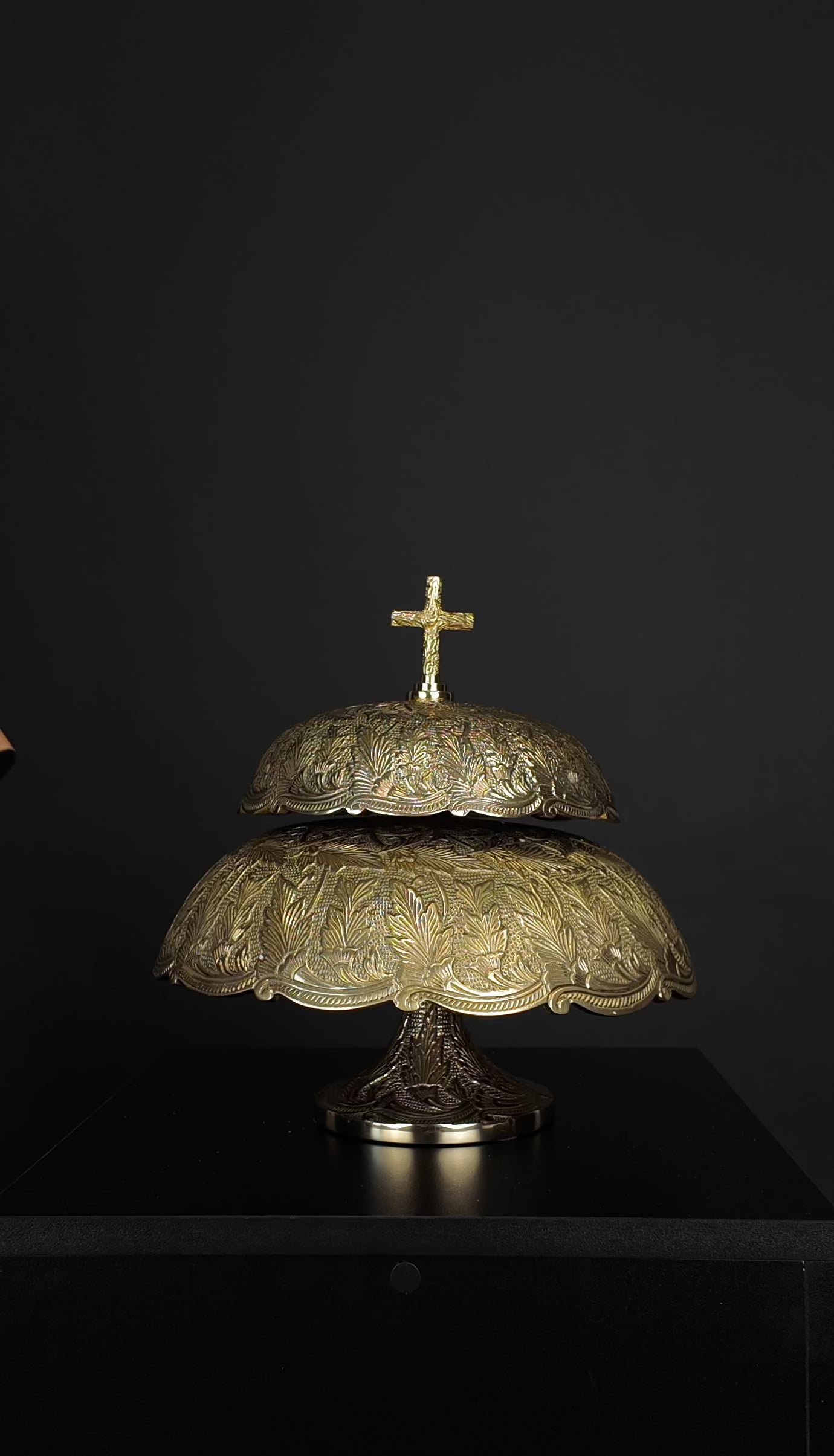 Ten bogato zdobiony gong, zwieńczony krzyżem to zarówno niezbędne wyposażenie kościoła, jak również niewątpliwa ozdoba, która zachwyci wiernych. Doskonała jakość wykonania, trwałość oraz bogactwo ozdobnych ornamentów czyni ten gong wyjątkowym artykułem liturgicznym.