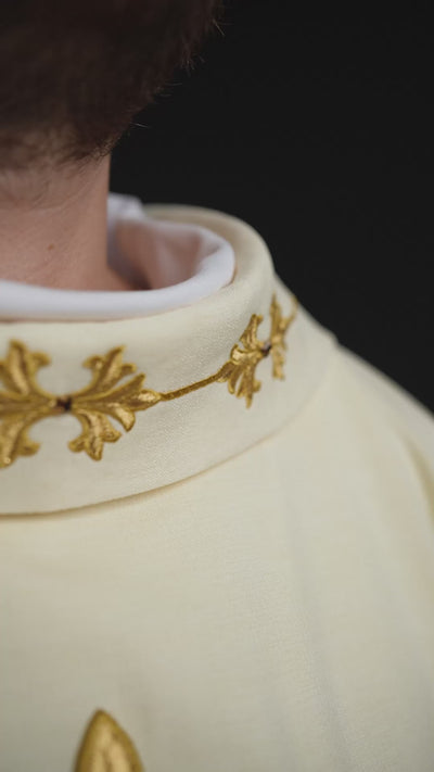 Ornat wykonany z bardzo wysokiej jakości tkaniny. Szata bogato haftowana sznurkiem ozdobiona kamieniami w każdym Krzyżu. Tkanina miła w dotyku. Kołnierz typu golf.