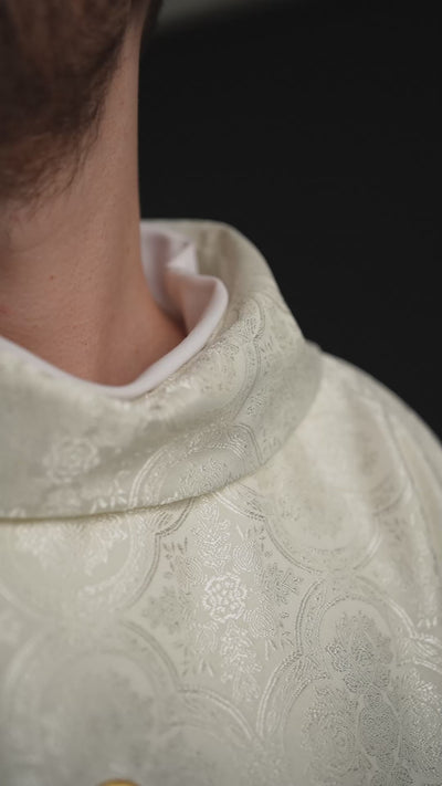 Nasz ornat, mistrzowsko wykonany z wysokiej jakości tkaniny, jest uosobieniem elegancji i głębokiego symbolizmu liturgicznego. Zdobiony haftem z symbolem eucharystycznym, wykonanym złotymi nićmi, który przedstawia krzyż, nasz ornat emanuje majestatem i pięknem. Satynowa, złota lamówka idealnie komponuje się z wyhaftowanym krzyżem, dodając szacie liturgicznej wyjątkowego blasku.