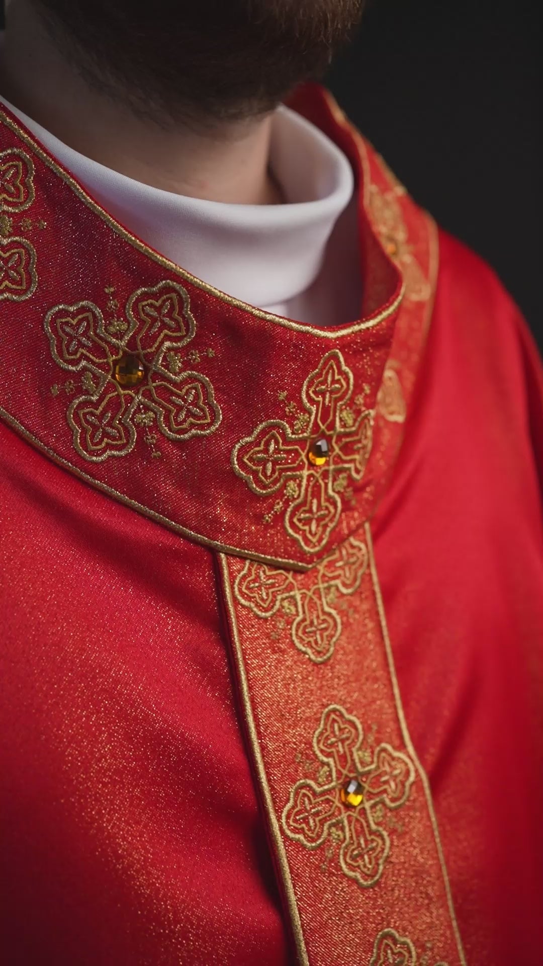 - Bogato zdobiony pas i kołnierz z kamieniami i haftem przedstawiającym krzyże, symbol wiary chrześcijańskiej. Złoty haft pięknie prezentuje się na czerwonej tkaninie, nadając ornatowi elegancki i wytworny charakter.