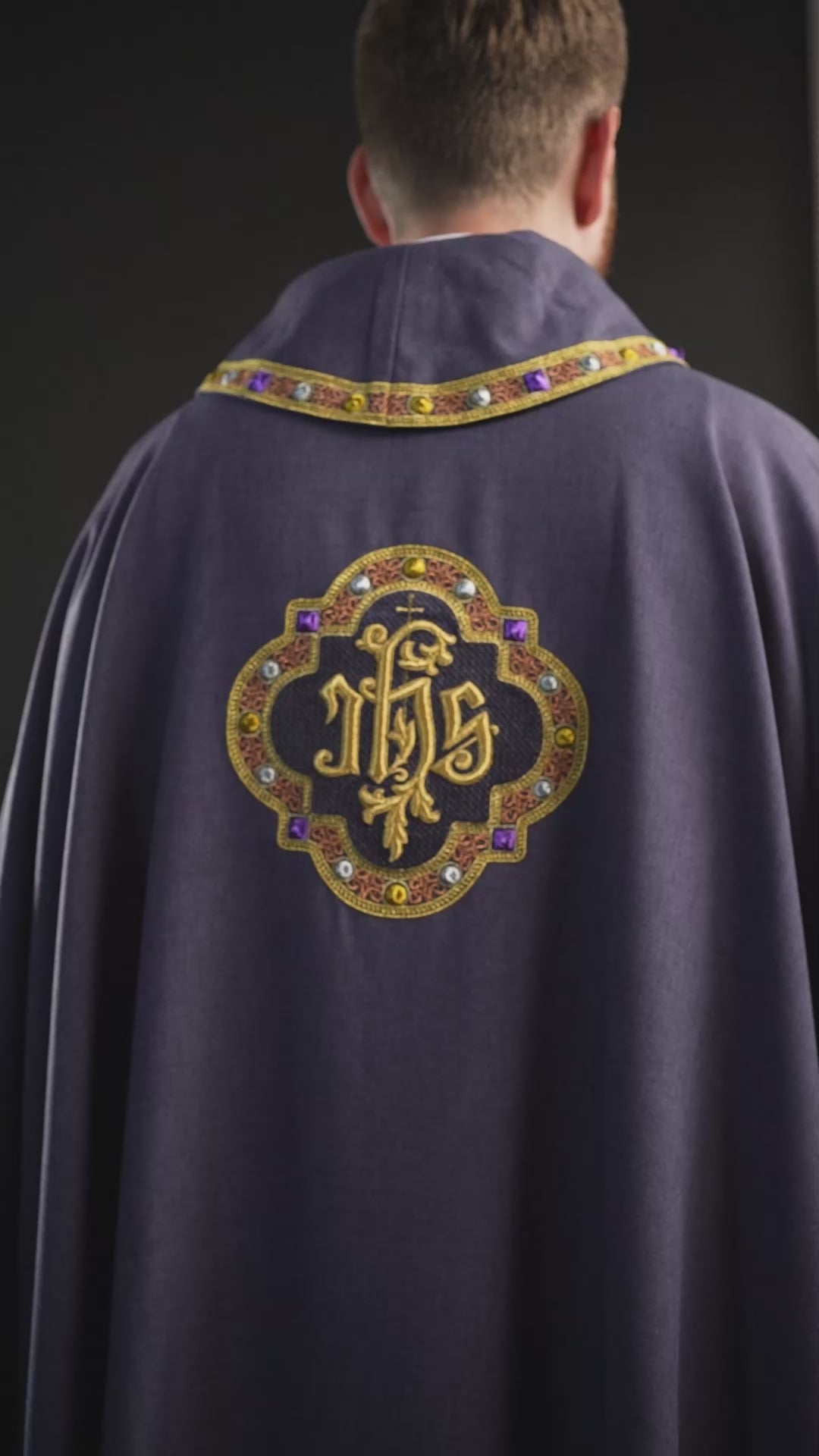 Nasz ornat, mistrzowsko wykonany z wysokiej jakości tkaniny, jest uosobieniem elegancji i głębokiego symbolizmu liturgicznego. Zdobiony ornat z bogato haftowaną lamówką wokół haftu IHS i kołnierza w kolorze fioletowym, nasz ornat emanuje majestatem i pięknem.