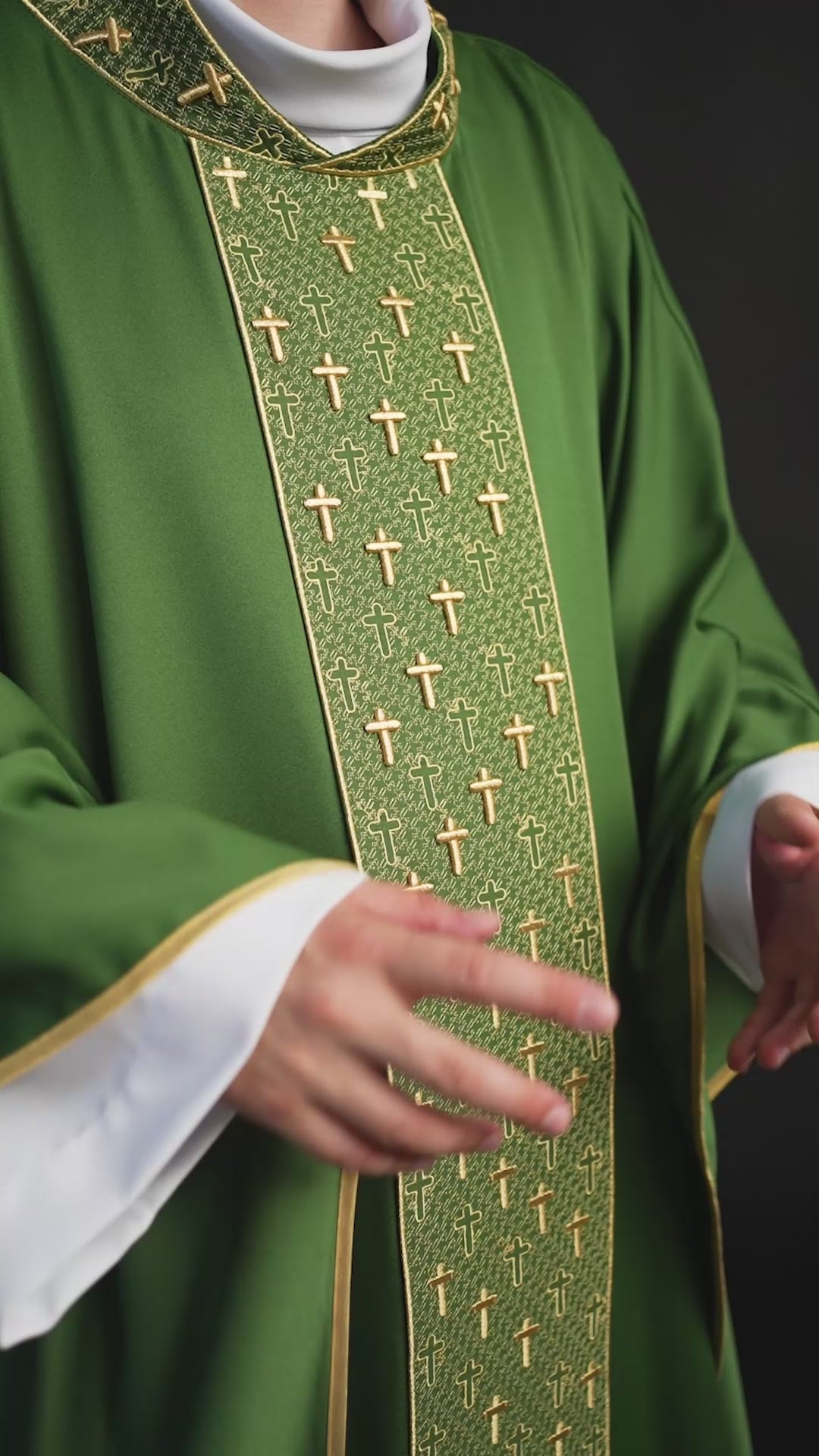 Nasz ornat, mistrzowsko wykonany z wysokiej jakości tkaniny, jest uosobieniem elegancji i głębokiego symbolizmu liturgicznego. Zdobiony z bogato haftowanym pasem w krzyże w kolorze zielonym, nasz ornat emanuje majestatem i pięknem.