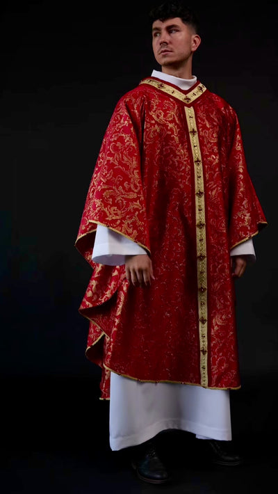 Ten unikatowy ornat to kwintesencja naszego 30-letniego doświadczenia w zdobnictwie haftem. Wykonany z najwyższej jakości tkaniny i ozdobiony ręcznie przyszywanymi naturalnymi kamieniami. Stanowi doskonałe połączenie piękna oraz funkcjonalności.