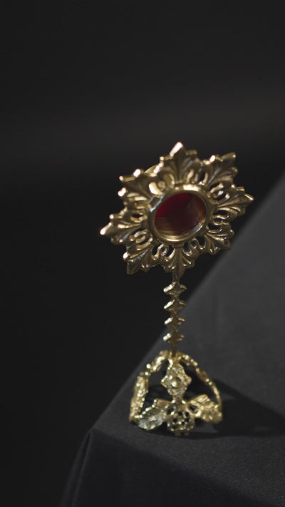 Bohato zdobený relikviár z mosadze vyrobený s najvyššou starostlivosťou o detaily. Efektívny mosadzný relikviár ideálny na výzdobu kostolov v barokovom štýle. Repozitórium je ozdobené motívom slnka s lúčmi. Má symbolizovať Ježiša Krista, ktorý ako slnko rozjasňuje temnoty noci, žiarou Vzkriesenia osvetľuje temnoty sveta.